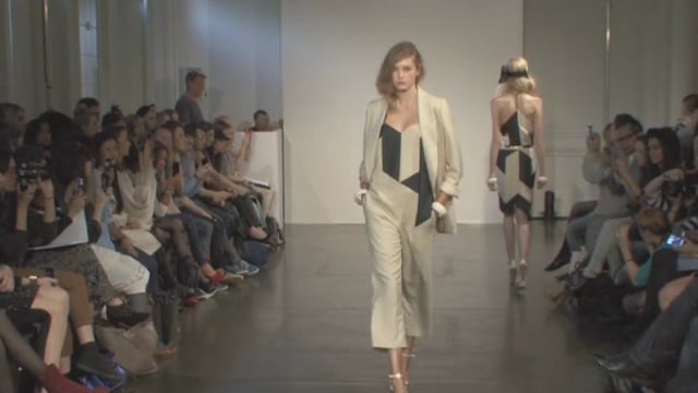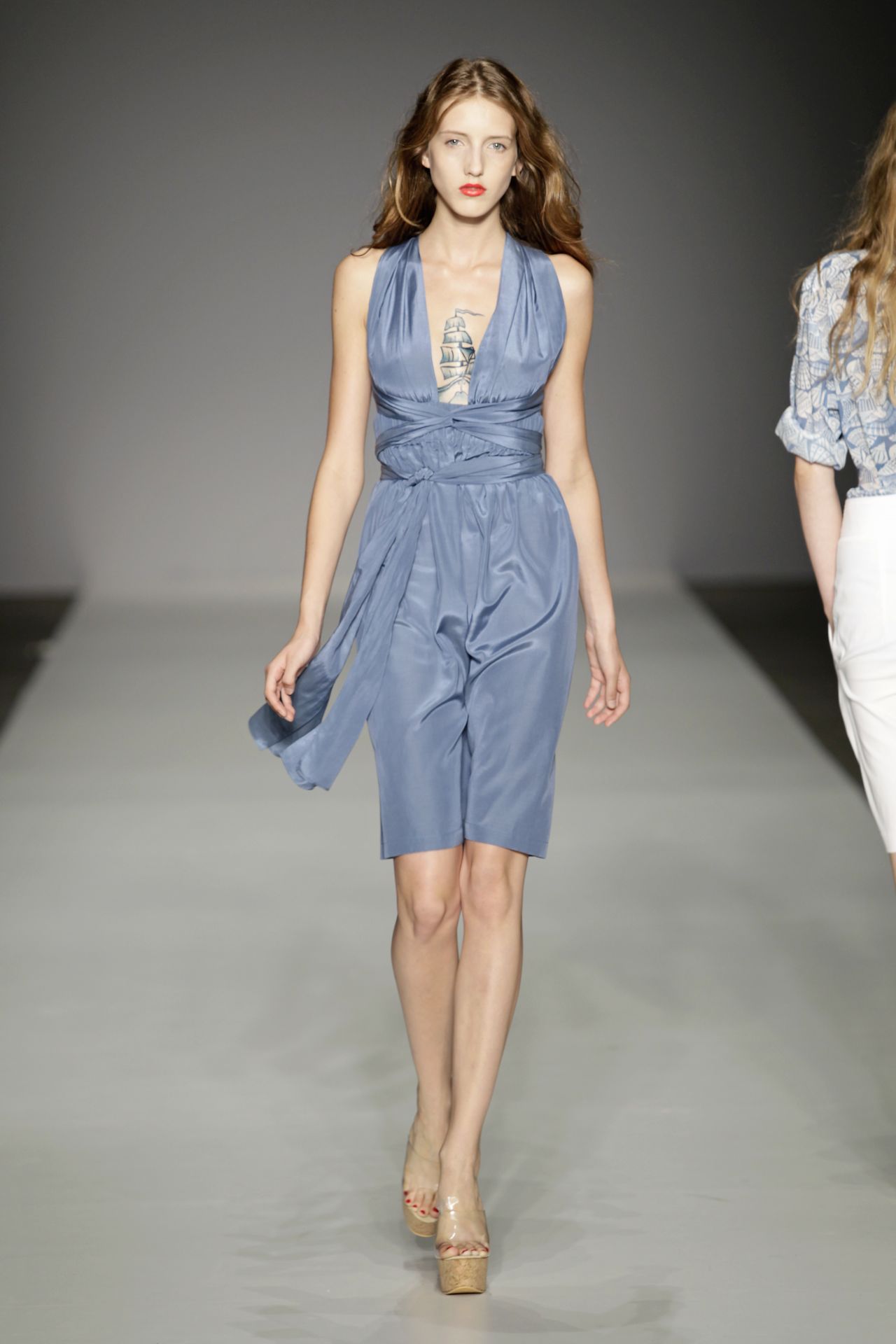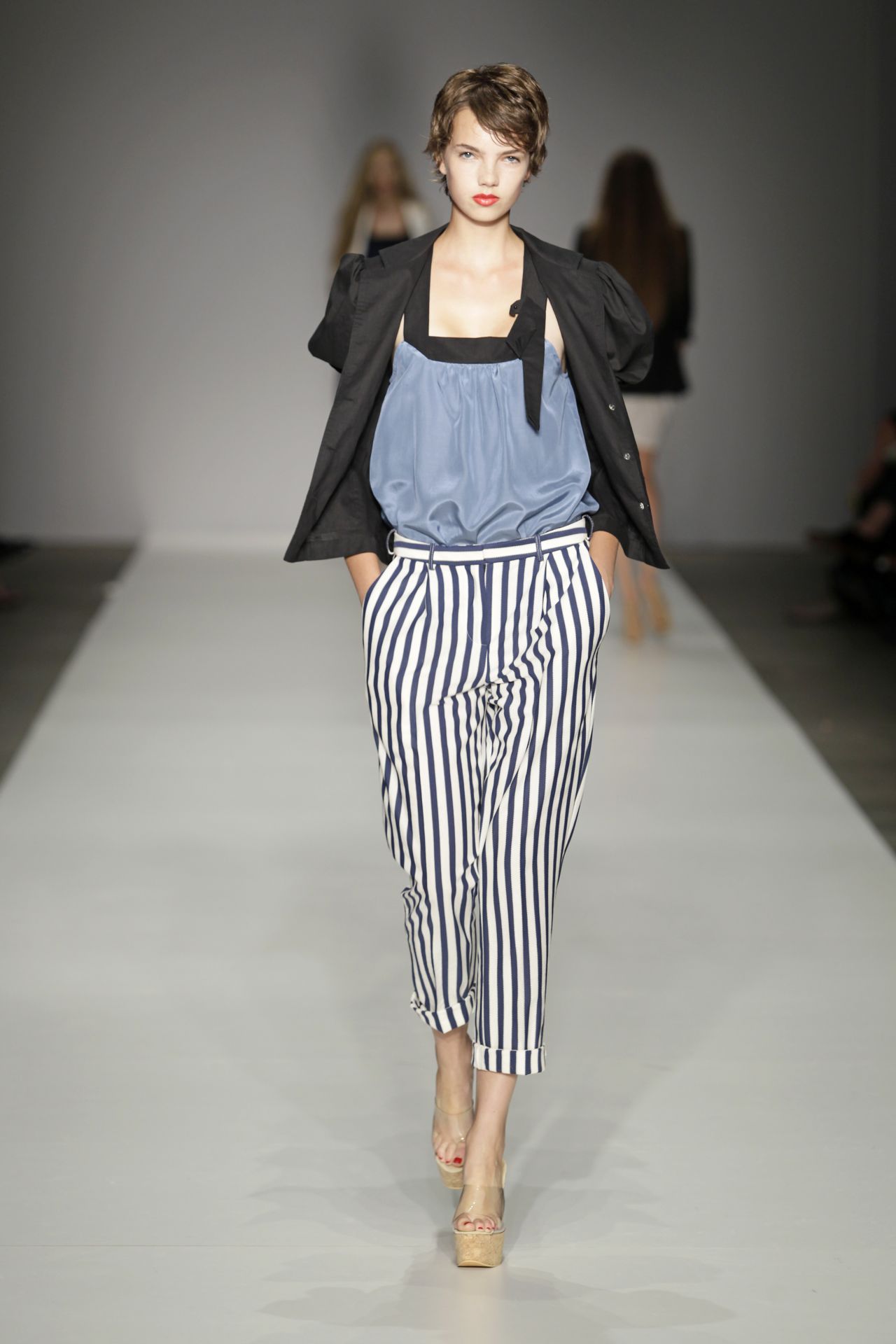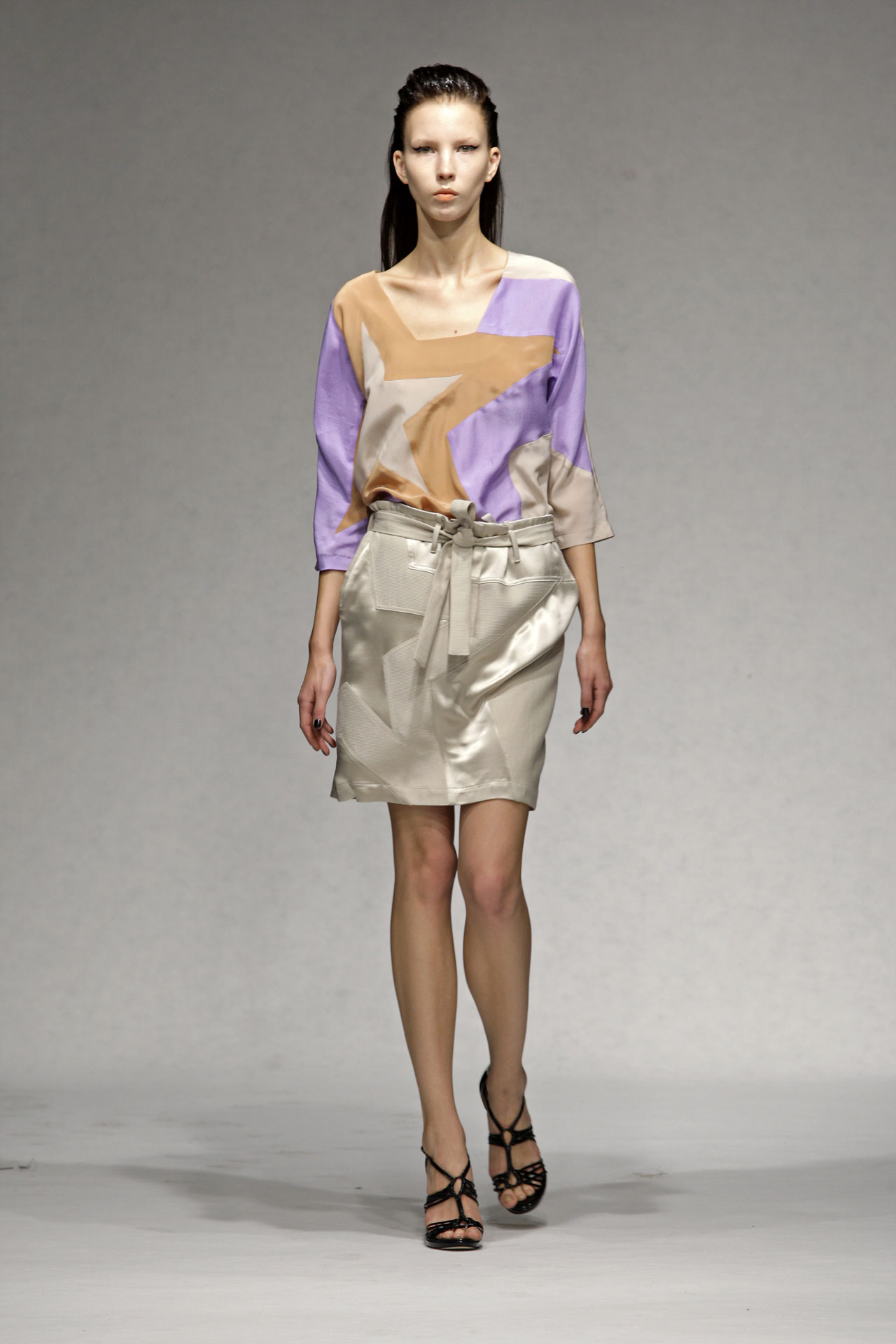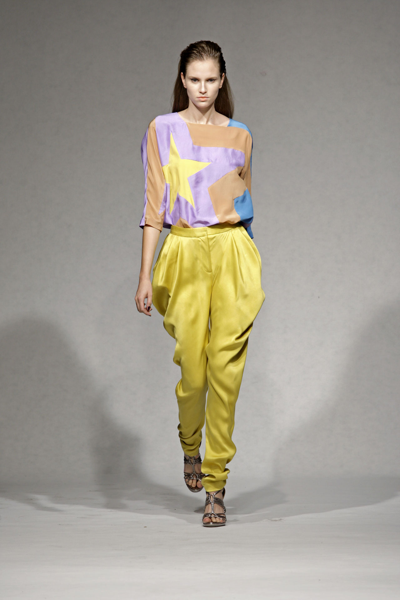 Referring to Greek cues, draping and graphic stars are integral to the collection. The materials are light and summery; Cotton blends mingle with Silk Crepe de Chine, Satin, Bamboo Voile, and Silk Poplin and light Wool. Stripes emphasize the draping and vary from diagonal to straight lines. The star shapes are subtle yet bold. Chunky lines and colour blocks contrast with petite shapes crafted using seams cleverly worked inside out.