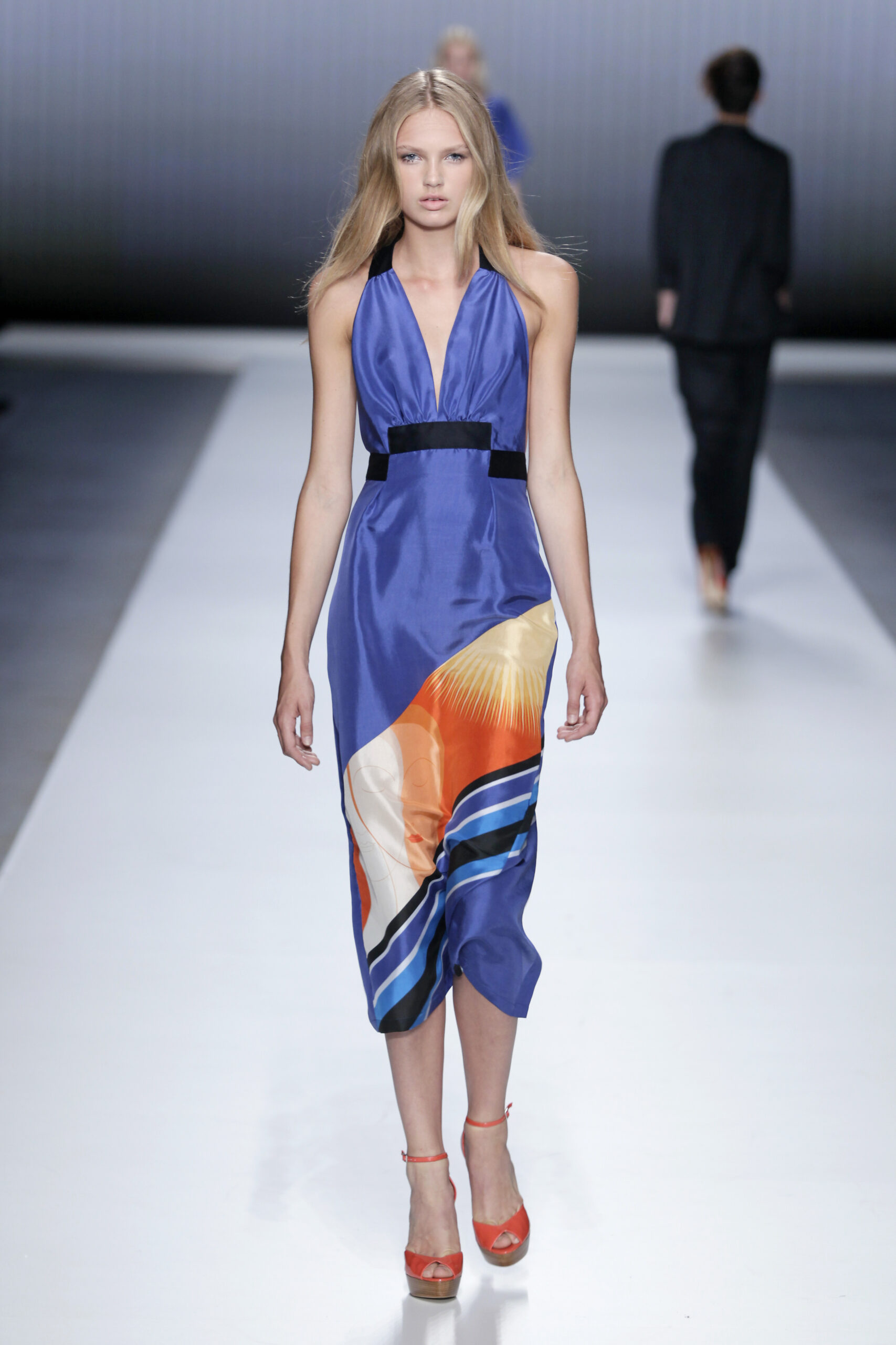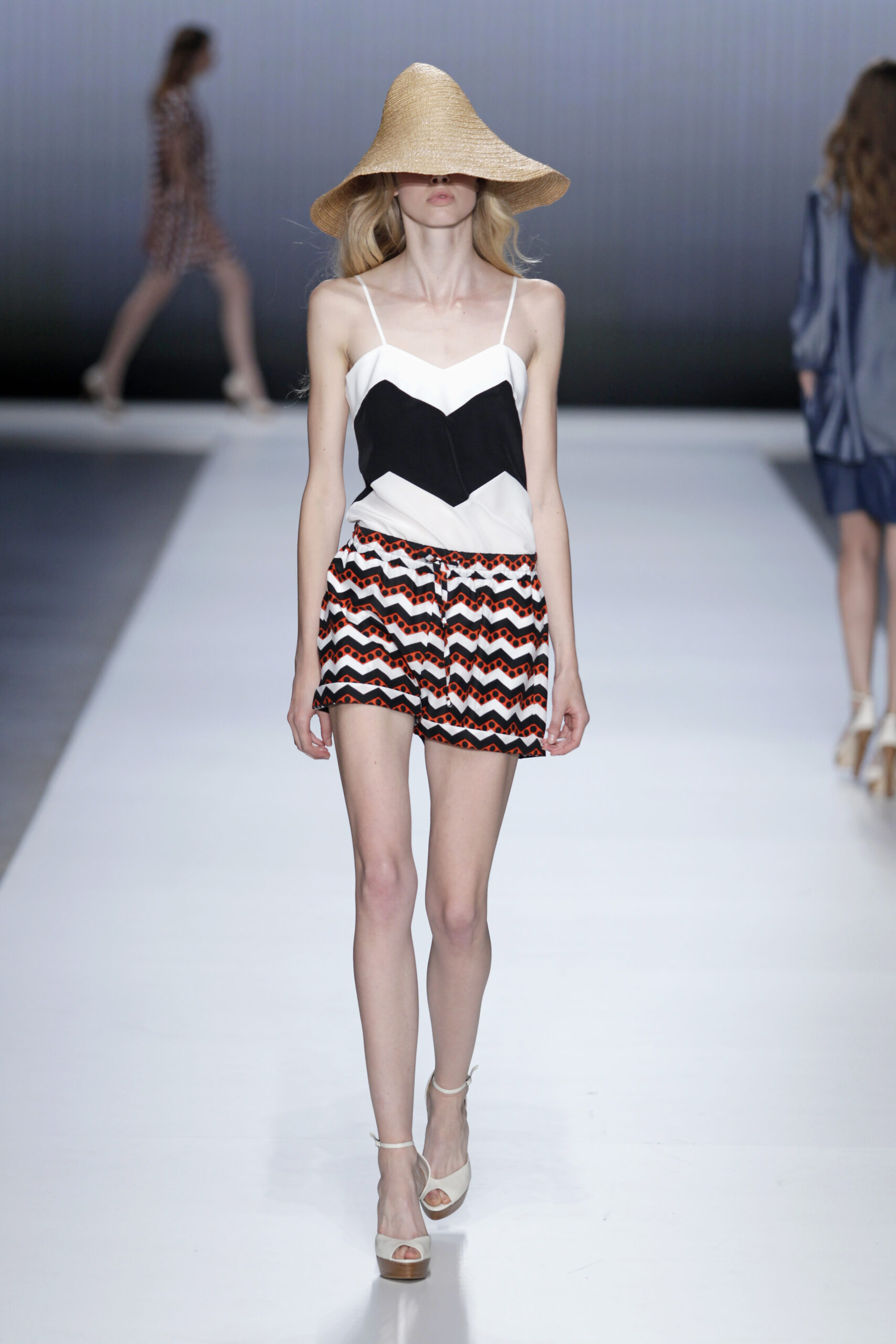 Rhombus shapes and Penrose figures are used to create the graphic patterns of straight dresses and skirts, elaborated in various combinations of soft tones and contrasting colours such as lime yellow, coral, Oriental blue, crystal pink, Sahara beige, ivory, and black. 3/4 length trousers and slouchy jackets in crinckle satin give the collection an elegant and easy touch. The Penrose figures are Ancient Arabic but translated in a modern way by using materials like techno linen, cotton lurex, silk twill and cotton blends.