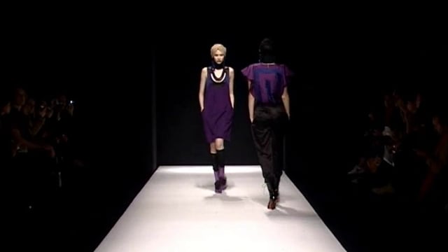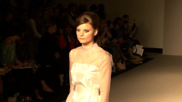 Oriental inspired shapes have clean lines and easy silhouettes in silk and crepe with brocade and duchess satin for more structured pieces. Silk satin, duchess satin, smocked metallic silk and glass-lacquer voile give a high-tech luxe feel. Colors are deep purple, aubergine, night-shade green, black, silver, copper, ochre and warm grey.